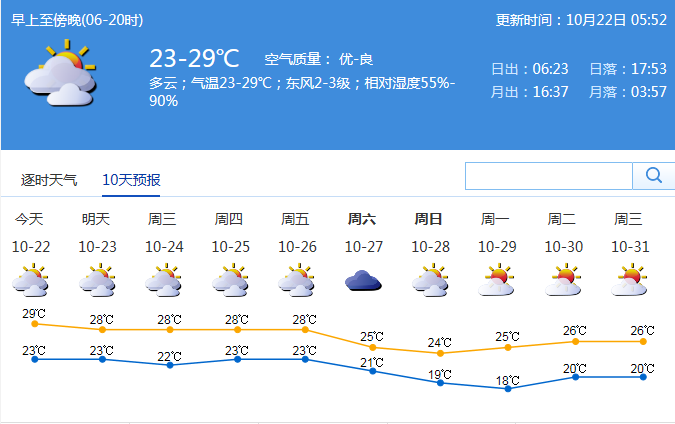 深圳新聞網(wǎng)訊 進(jìn)入10月中旬,西太平洋上的臺(tái)風(fēng)們終于“安靜”下來,冷空氣逐漸成為接下來的主角,我國北方城市也紛紛步入秋季。盡管全市在10月11日早晨全市最低氣溫普遍在20℃左右,但距真正入秋還有一定距離。據(jù)市氣象局預(yù)測,22日至26日我市大致多云,間中有小雨,最低氣溫22-24℃,最高氣溫27-29℃。