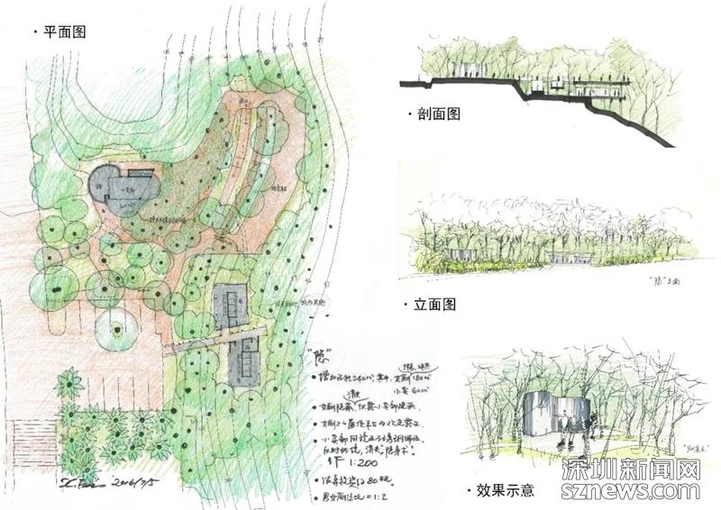 費(fèi)曉華在文中提到,“隨著深圳人口和游客的劇增,蓮花山頂公共廁所已不堪負(fù)重,急需擴(kuò)大規(guī)模。2016年,本人受蓮花山公園管理處的邀請(qǐng),免費(fèi)為他們提供了改擴(kuò)建方案。方案共有兩種思路:‘隱擴(kuò)’和‘顯擴(kuò)’,均是在保留原建筑的基礎(chǔ)上,擴(kuò)大使用面積以滿足更多人的需求。從更好地保護(hù)自然環(huán)境的角度出發(fā),本人推薦‘隱擴(kuò)’方案?!?(附設(shè)計(jì)圖)