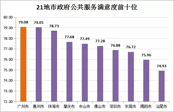 在調(diào)查的122個(gè)縣(市、區(qū))中,越秀區(qū)政府公共服務(wù)總體滿意度最高(83.95分),連續(xù)五年在縣(市、區(qū))評價(jià)中居首;隨后依次為:天河區(qū)、惠城區(qū)、端州區(qū)、光明區(qū)、南山區(qū)、斗門區(qū)、從化區(qū)、南沙區(qū)、順德區(qū),居前十位的均處于珠三角地區(qū),是我省公共服務(wù)建設(shè)標(biāo)桿地區(qū)。