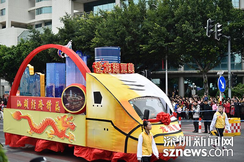 帶有汕頭經(jīng)濟(jì)特區(qū)字樣的花車(chē)正在行進(jìn)