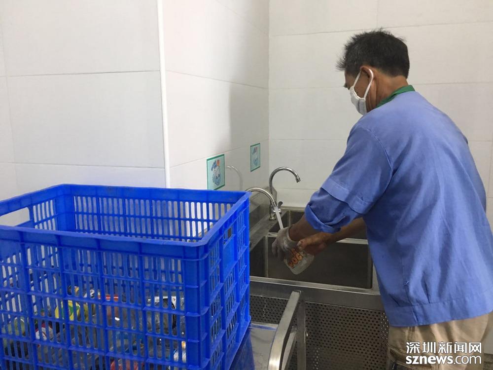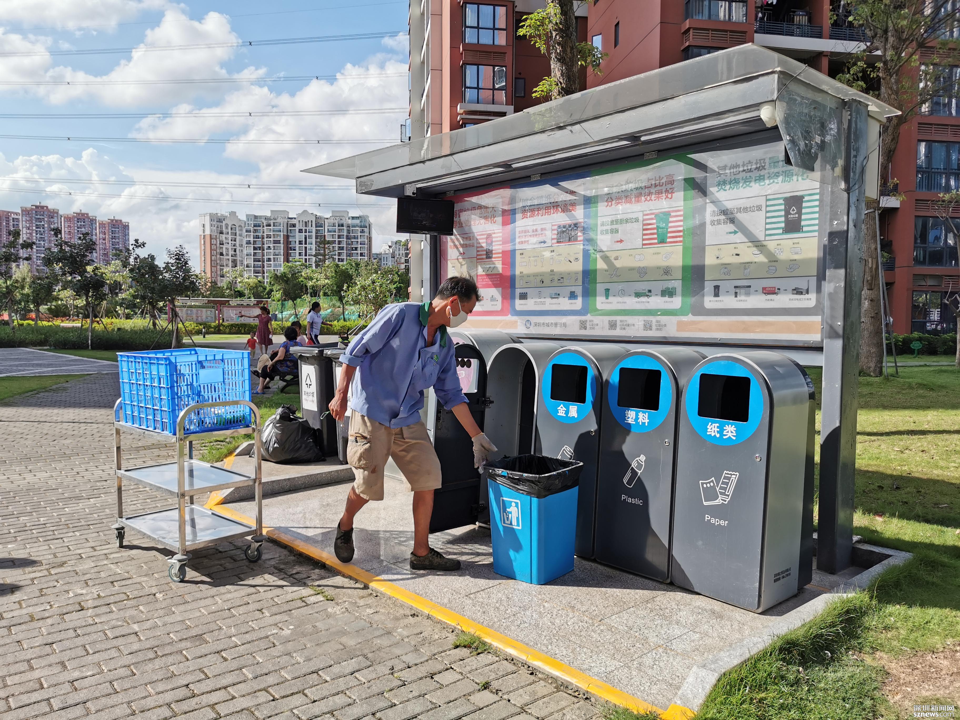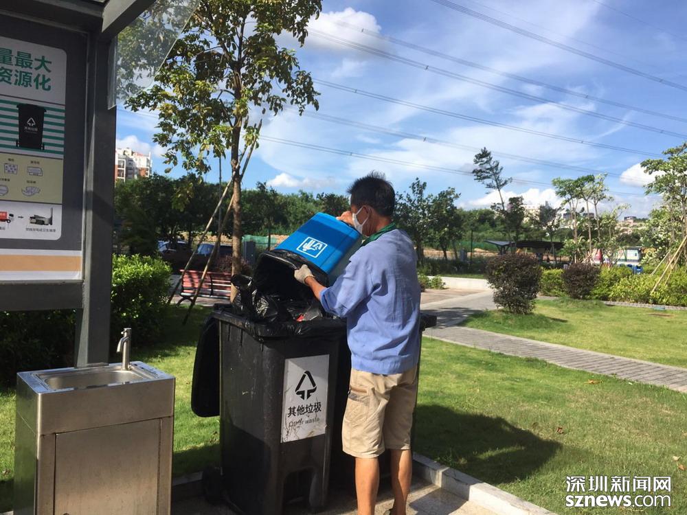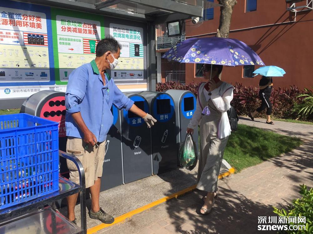 鄧伯今年60歲,是來深圳帶孫子的,因為老伴能幫忙,所以他應(yīng)聘成為了一名小區(qū)清潔員。小區(qū)實行垃圾分類一年多以來,鄧伯工作輕松了很多。每天他只需巡視幾遍垃圾桶,將滿了的垃圾裝在框里帶回暫存點,進(jìn)行二次分揀和清洗后,再將垃圾桶歸放原處;等物業(yè)在微信平臺上聯(lián)系好運(yùn)送車輛,協(xié)助運(yùn)送人員運(yùn)走垃圾就行。