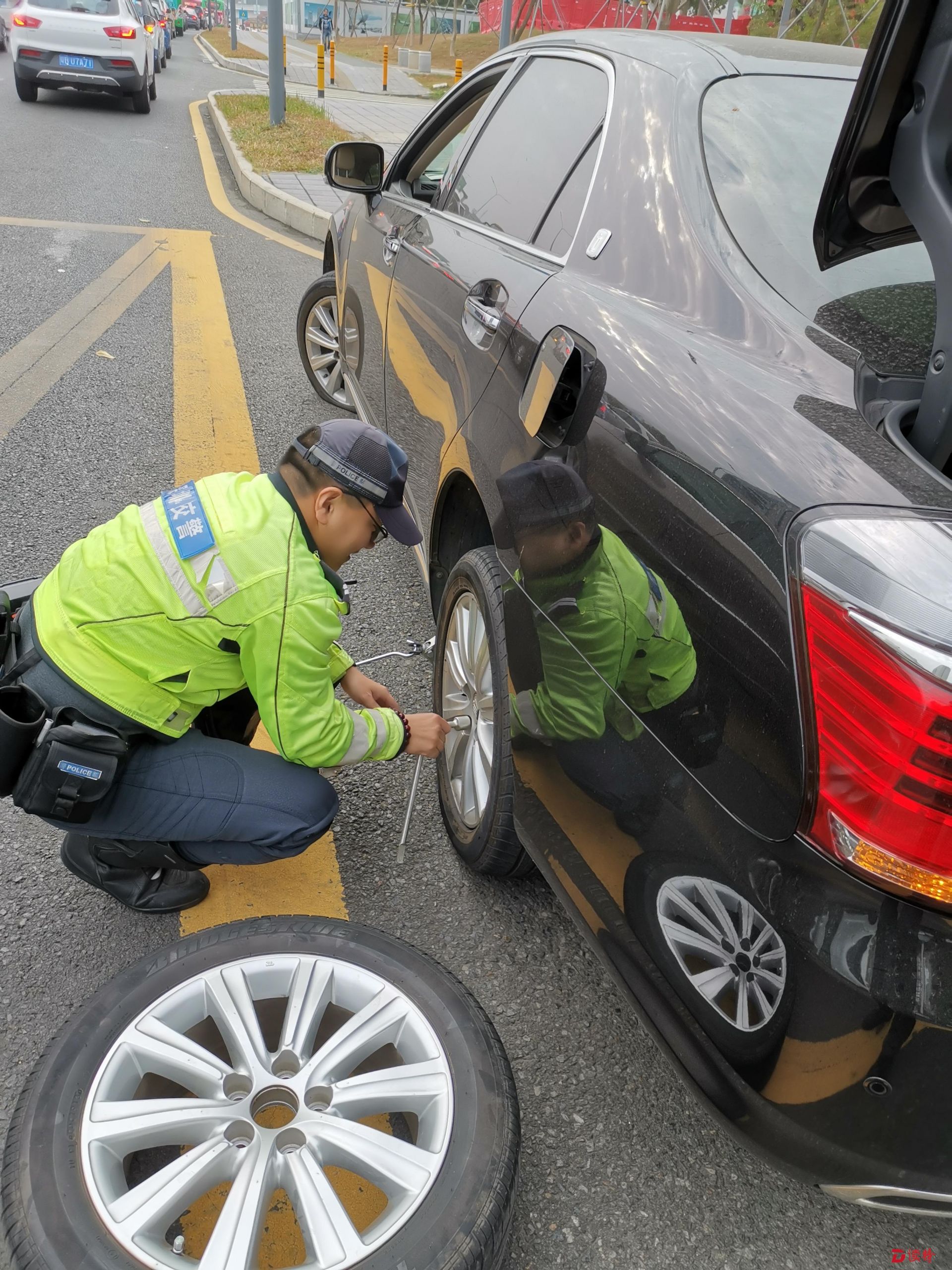正當(dāng)記者心急如焚且束手無策之時,在路上巡查的福田交通大隊香蜜湖中隊鐵騎鄭彬銳警官途經(jīng)此地,見狀他立即停住鐵騎,上前詢問情況。當(dāng)他看到車輛左側(cè)兩輪均癟下時,立即問記者是否有備胎,同時讓記者趕緊聯(lián)系車行再送一個備胎過來。