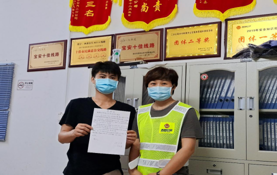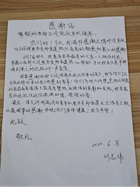 見圳客戶端·深圳新聞網(wǎng)2020年6月9日訊(深圳特區(qū)報記者 徐興東)6月9日早上,一位自稱劉先生的年輕人冒著滂沱大雨來到了西部公汽寶永車隊。一進辦公室,劉先生雙手捧著將親筆寫的一封感謝信呈給了隊助張喜鳳,并深有感觸地說道:“多災(zāi)多難的父親有幸遇到乘務(wù)員鄭錄蓮的熱心幫助,并想方設(shè)法聯(lián)系上我。謝謝你們的成全,才讓我在父親節(jié)即將到來之時還能叫一聲爸爸,我將終生銘記諸位的大恩大德!”樸實無華的話語,感染了在場的每一個人,分明看出個個眼里都閃爍著晶瑩的喜悅淚花。
