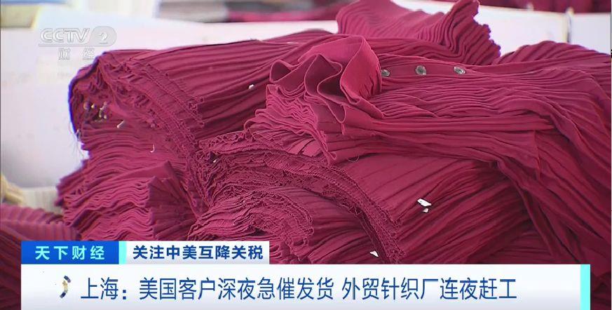 在中美大幅互降關(guān)稅后,位于上海松江區(qū)李塔匯鎮(zhèn)的一家針織廠,接到了美國客戶可以出貨的通知。已經(jīng)在包裝車間里堆了1個月的50000多件成衣,終于可以開啟最后的工序,車間內(nèi)的工人全員上崗,縫商標(biāo)、熨燙、打吊牌,各個工序有條不紊。