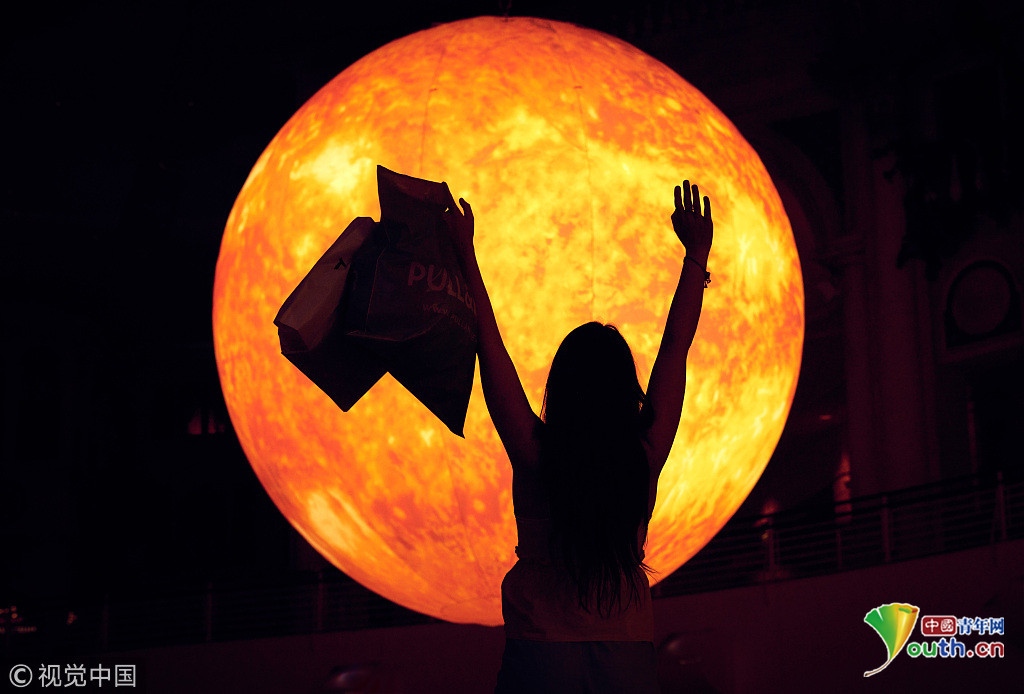 當(dāng)?shù)貢r間2018年9月18日,英國曼切斯特,顧客們在特拉福德購物中心的一個巨型的“太陽”下享受室內(nèi)日光浴,感受英國未完的史上最熱夏天。這個人造“太陽”的亮度相當(dāng)于1.2萬個燈泡。圖片來源:視覺中國