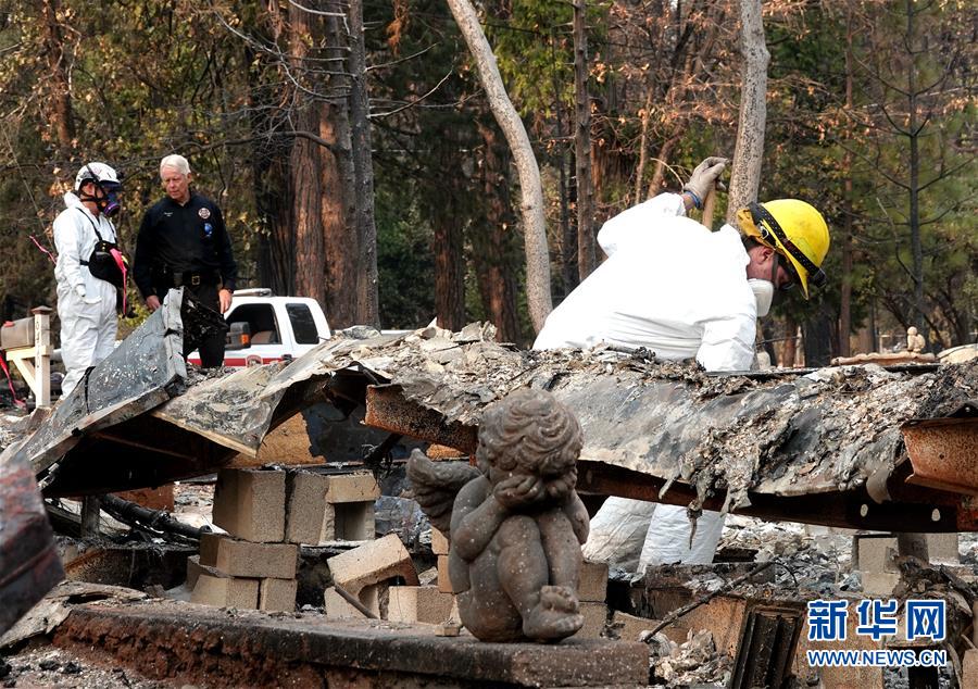 11月19日,在美國加利福尼亞州比尤特縣天堂鎮(zhèn),救援人員在山火廢墟中工作。新華社記者吳曉凌攝