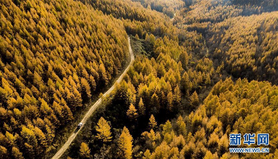 2018年10月8日,一輛汽車行駛在山西省沁源縣好地方林場的林間道路上。 大地之色,俯仰之間;壯美山河,是我的祖國。2018年,新華社記者操縱無人機“飛閱”華夏大地,在最美的時節(jié),定格下她的色彩斑斕。 新華社記者 陶明 攝