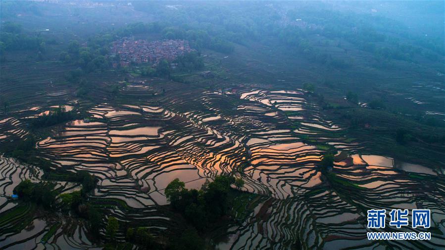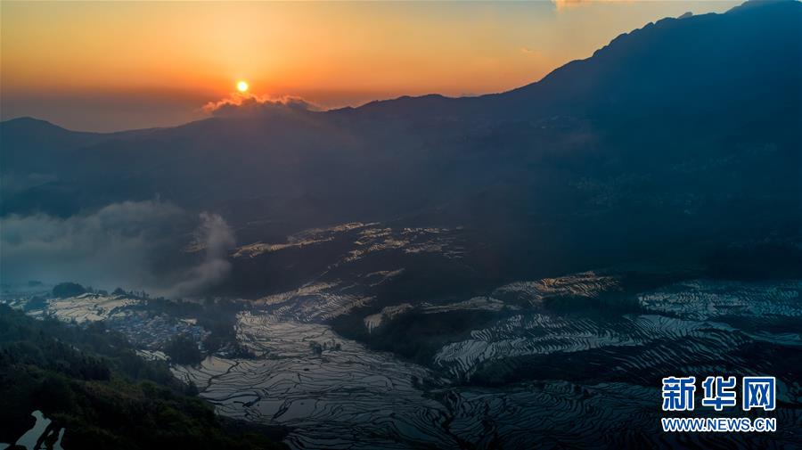 這是在云南省元陽縣拍攝的傍晚時分的哈尼梯田美景(4月3日無人機拍攝)。哈尼梯田位于云南省哀牢山南部,以哈尼族為主的當地群眾千百年來生生不息在大地上“雕刻”出這一農耕文明奇觀。春日里,漫山的水稻梯田與云海、森林、村莊形成一幅美麗的畫卷,吸引眾多海內外游客前來觀賞。新華社記者 胡超 攝