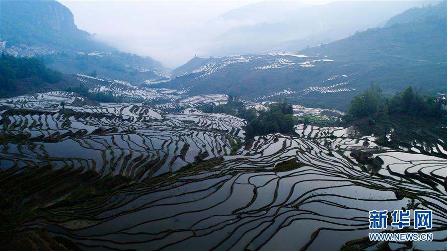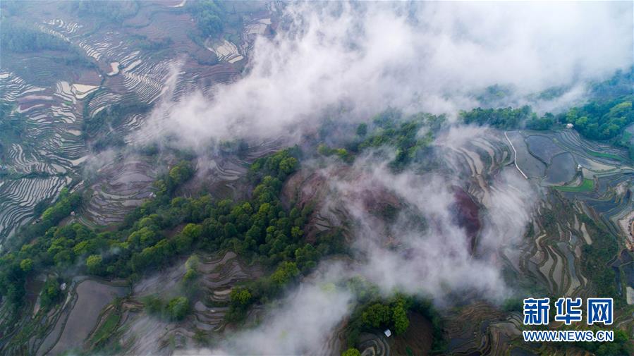 這是在云南省元陽縣拍攝的晨曦中的哈尼梯田美景(4月4日無人機拍攝)。哈尼梯田位于云南省哀牢山南部,以哈尼族為主的當地群眾千百年來生生不息在大地上“雕刻”出這一農耕文明奇觀。春日里,漫山的水稻梯田與云海、森林、村莊形成一幅美麗的畫卷,吸引眾多海內外游客前來觀賞。新華社記者 胡超 攝