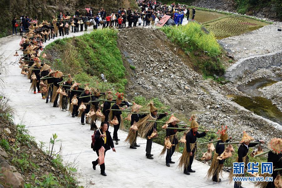 4月7日,苗族群眾挑著野炊所需用具,走在祭“巫耶”民俗活動途中。4月6日至7日,在貴州省黔東南苗族侗族自治州劍河縣觀么鎮(zhèn)新民村和新合村,來自劍河縣和三穗縣的苗族同胞歡聚一堂,通過民族歌舞展演、非遺手工藝展示、千戶祭“巫耶”、跳蘆笙舞等形式,與來賓一起歡慶2019年高雍苗族“三月三”民俗文化節(jié)。 新華社記者 楊文斌 攝