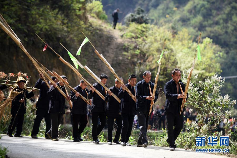 4月7日,苗族群眾吹著蘆笙走在參加“三月三”民俗活動途中。4月6日至7日,在貴州省黔東南苗族侗族自治州劍河縣觀么鎮(zhèn)新民村和新合村,來自劍河縣和三穗縣的苗族同胞歡聚一堂,通過民族歌舞展演、非遺手工藝展示、千戶祭“巫耶”、跳蘆笙舞等形式,與來賓一起歡慶2019年高雍苗族“三月三”民俗文化節(jié)。 新華社記者 楊文斌 攝