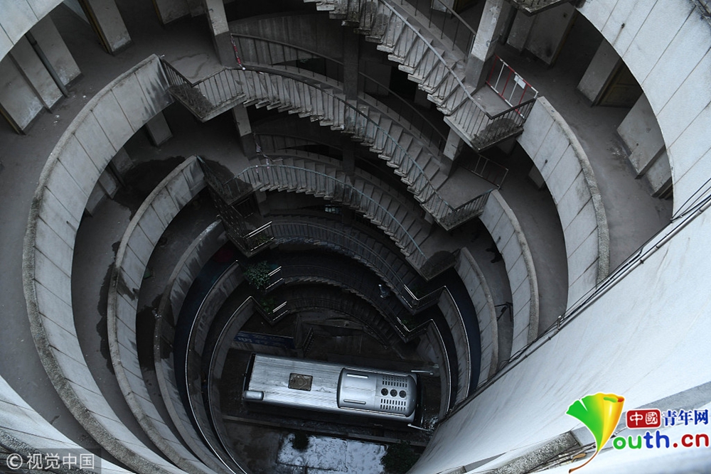 探秘重慶魔幻八層圓筒型轉(zhuǎn)轉(zhuǎn)樓 公交車穿其而過