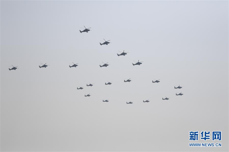 10月1日上午,慶祝中華人民共和國(guó)成立70周年大會(huì)在北京天安門廣場(chǎng)隆重舉行。這是20架直升機(jī)在空中組成“70”字樣。新華社記者王凱攝