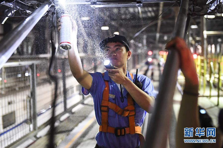 “動(dòng)車醫(yī)生”用檢漏劑對(duì)受電弓升弓氣囊進(jìn)行檢查(10月2日攝)。 新華社記者 曹祎銘 攝