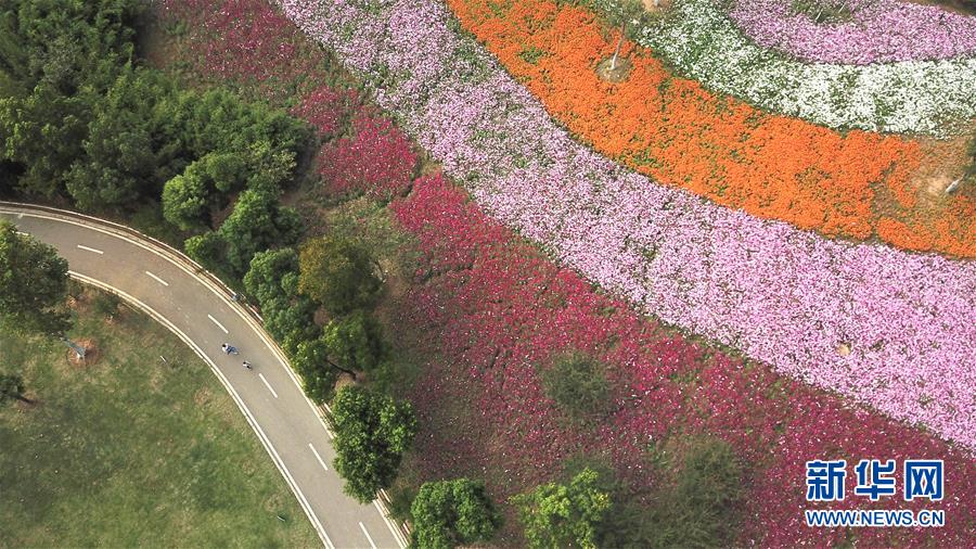 10月9日,游人在四季花海城市公園游覽(無人機拍攝)。 秋日時節(jié),位于安徽省合肥市的四季花海城市公園花香四溢,色彩繽紛,成為游客和市民休閑游玩的好去處。 新華社記者 張端 攝