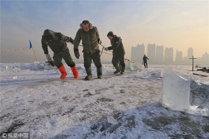 2018年12月11日,黑龍江省哈爾濱市,松花江上,采冰者們彎腰拉繩,宛如纖夫般拽重達(dá)半噸的冰塊出水。采冰者都是自哈市江北萬寶、東發(fā)、沙陀子等鄉(xiāng)鎮(zhèn)的農(nóng)民,他們每年冬閑時(shí)都會親屬、村鄰之間結(jié)伴到松花江畔采冰,有的采冰人,已經(jīng)連續(xù)干了二十多年。每個(gè)采冰季,他們每天要在冰面上工作10-12個(gè)小時(shí),每個(gè)采冰組,一天要拽出冰塊2000-3000塊,一個(gè)近20天的采冰季,每人能收入近萬元。視覺中國