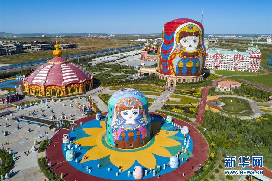 8月29日無人機拍攝的滿洲里市套娃廣場景區(qū)。滿洲里市位于呼倫貝爾大草原腹地。新華社記者彭源攝