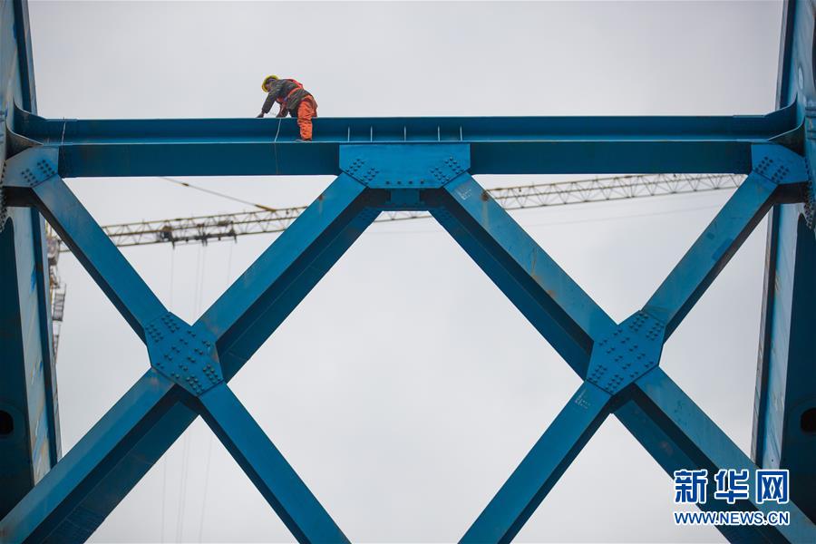 3月14日,施工人員在鴨池河特大橋上拆除輔助設施。新華社記者劉續(xù)攝