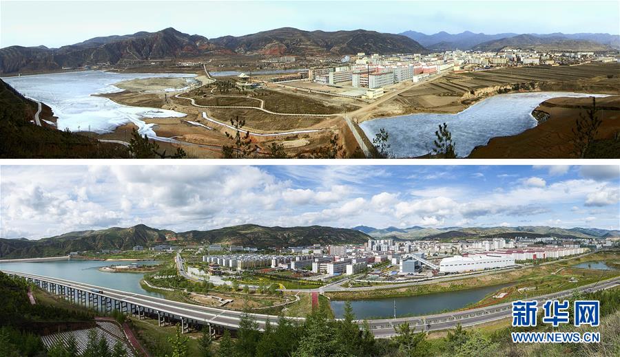 拼版照片:上圖為2009年1月30日拍攝的寧夏固原市隆德縣境內的渝河景象;下圖為經(jīng)過流域綜合治理后的渝河(2018年5月19日攝)。 新華社發(fā)(李玉 攝)