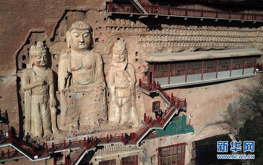 12月26日,游客在麥積山石窟參觀游覽(無(wú)人機(jī)拍攝)。新華社記者馬寧攝