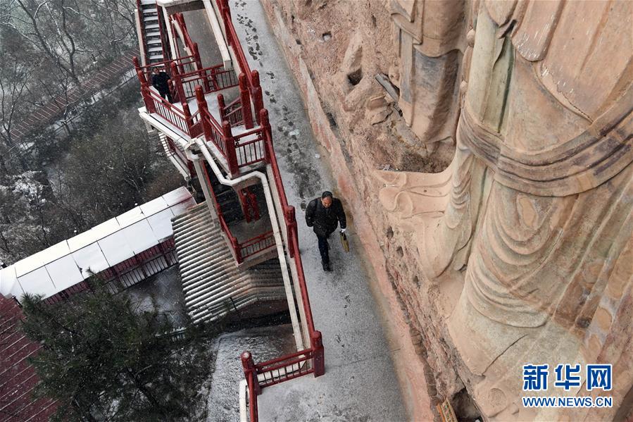 12月25日,在麥積山石窟,修復(fù)師牟常有走出石窟準(zhǔn)備吃午飯。新華社記者馬寧攝