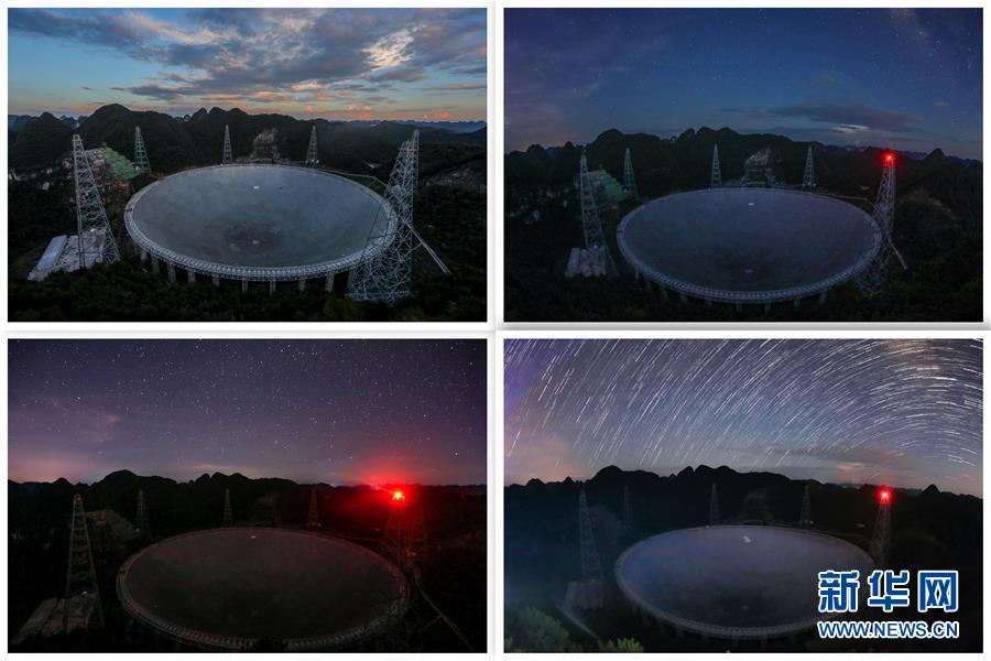 8月28日拍攝的不同光線環(huán)境下的“中國(guó)天眼”(拼版照片,檢修期間拍攝)。新華社記者歐東衢攝