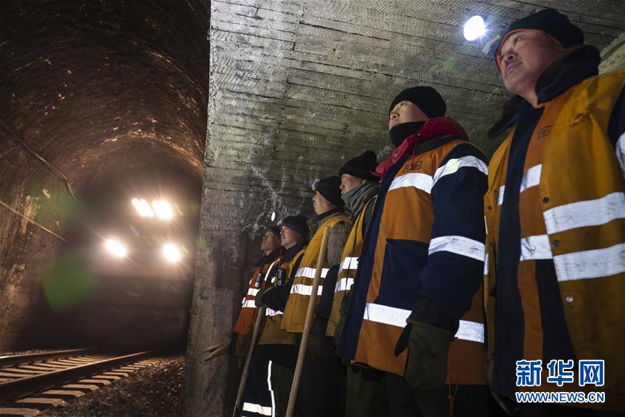 1月9日,在加格達奇工務段西羅奇嶺二號隧道,西羅奇維修工隊工作人員在避車洞內躲避列車。新華社記者王毓國攝
