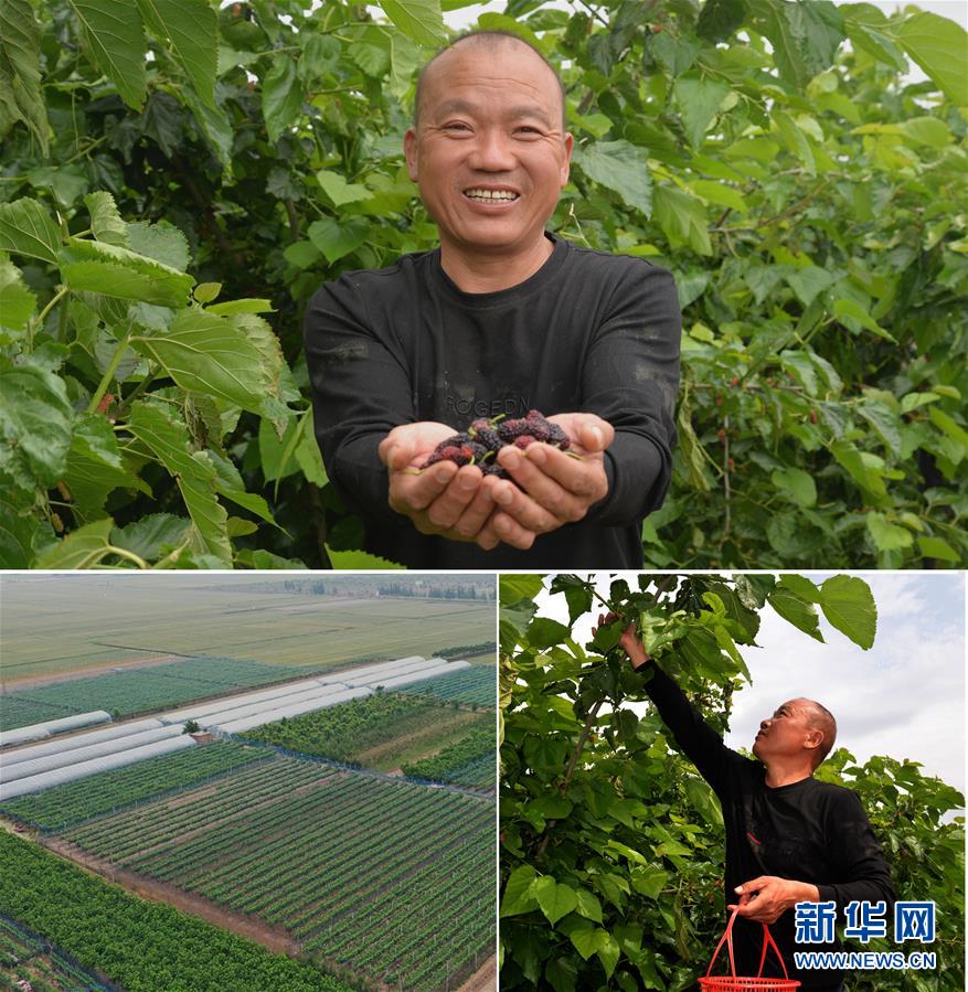 這是一張拼版照片(圖片均為5月16日攝)。上圖:在河南省開封市尉氏縣大橋鄉(xiāng)馮村,50歲的文海軍在他的黃瓜種植大棚內(nèi)采摘黃瓜;下左圖:在扶貧政策扶持下,文海軍蓋了占地6畝的蔬菜溫室大棚(無人機(jī)照片);下右圖:文海軍駕駛?cè)嗆囘\(yùn)輸采摘的黃瓜。新華社記者孫清清攝