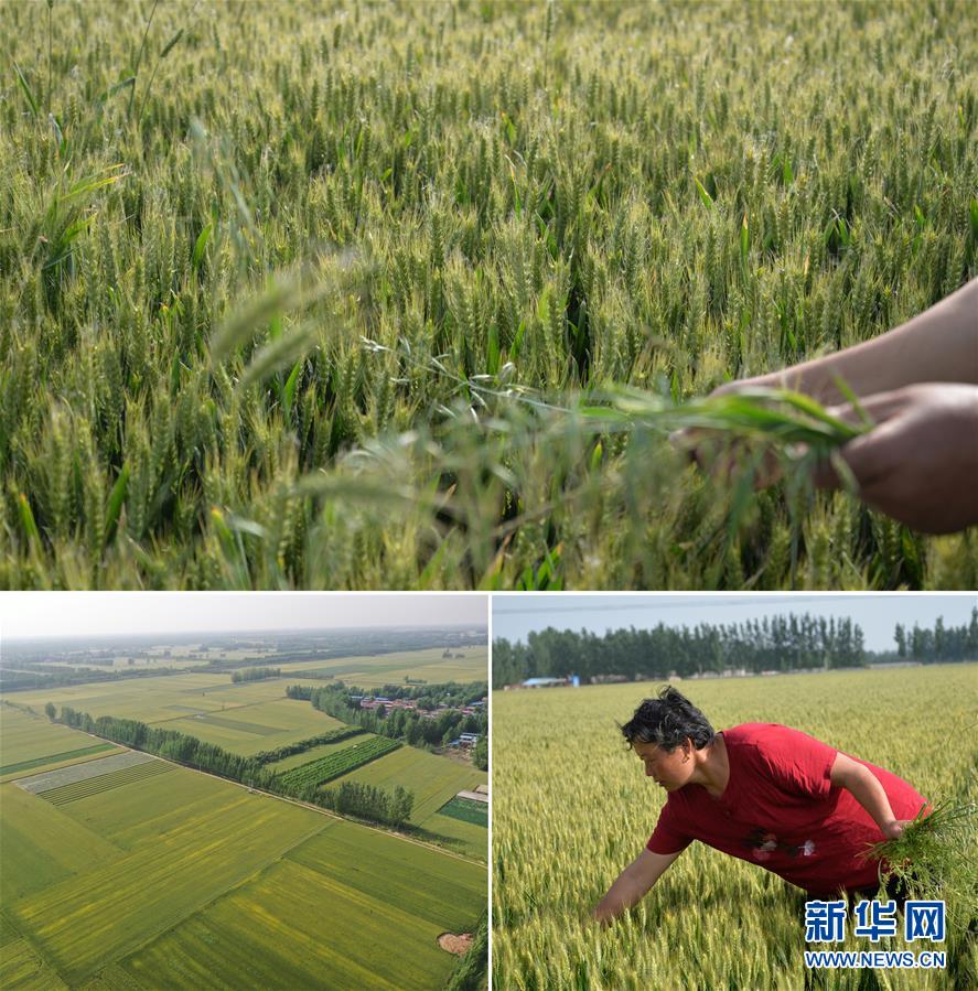 這是一張拼版照片(圖片均為5月16日攝)。上圖、下右圖:在河南省開封市尉氏縣十八里鎮(zhèn)趙崗村,村民郭菊在麥田內(nèi)清除雜草。今年她家流轉(zhuǎn)土地種了18畝小麥,長(zhǎng)勢(shì)良好。下左圖:尉氏縣十八里鎮(zhèn)趙崗村附近集中連片的麥田即將迎來收獲(無(wú)人機(jī)照片)。新華社記者孫清清攝