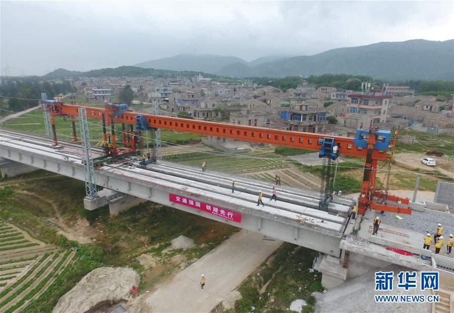 5月20日,福平鐵路洋中特大橋最后一片T型梁成功架設(無人機照片)。新華社記者林善傳攝
