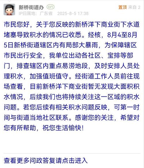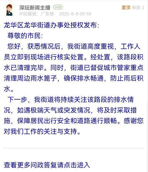 您好,獲悉情況后,我街道高度重視,工作人員立即到現(xiàn)場進行核實處置。經(jīng)處置,該路段積水已清理完畢。同時,街道已督促城市管家重點清理周邊雨水篦子,確保排水暢通,防止雨后積水。