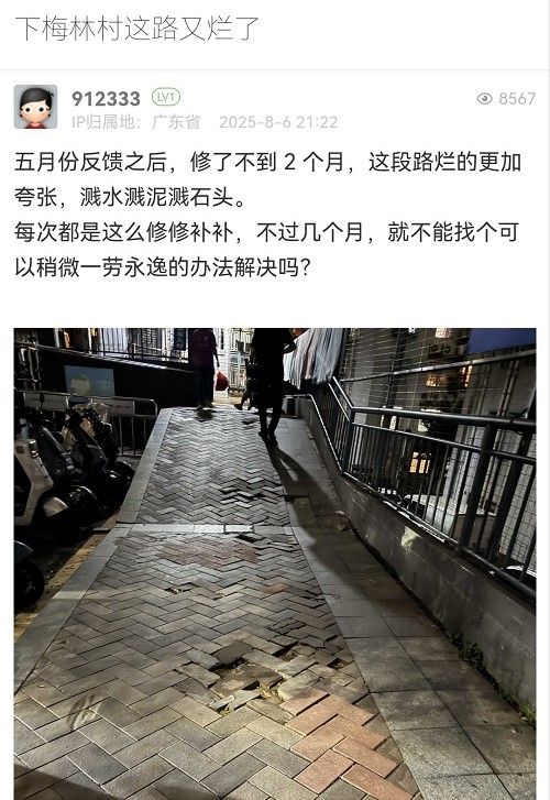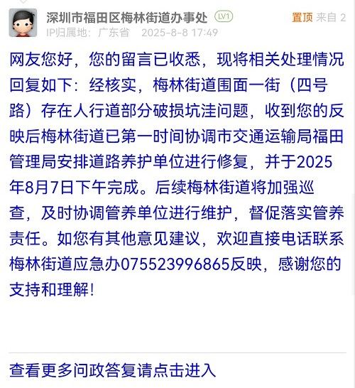 網(wǎng)友您好,您的留言已收悉,現(xiàn)將相關(guān)處理情況回復(fù)如下:經(jīng)核實,梅林街道圍面一街(四號路)存在人行道部分破損坑洼問題,收到您的反映后梅林街道已第一時間協(xié)調(diào)市交通運輸局福田管理局安排道路養(yǎng)護單位進行修復(fù),并于2025年8月7日下午完成。后續(xù)梅林街道將加強巡查,及時協(xié)調(diào)管養(yǎng)單位進行維護,督促落實管養(yǎng)責(zé)任。如您有其他意見建議,歡迎直接電話聯(lián)系梅林街道應(yīng)急辦075523996865反映,感謝您的支持和理解!