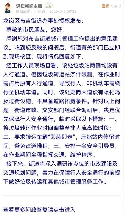 經(jīng)工作人員現(xiàn)場查看,該處垃圾站兩側(cè)均設(shè)有人行通道。但因垃圾轉(zhuǎn)運站條件限制,在作業(yè)時需占用原有人行通道,導(dǎo)致行人、非機動車需繞行至機動車道。同時,該處龍崗大道設(shè)有渠化島及過街設(shè)施,不具備道路拓寬條件。針對以上問題,街道市政、交安部門經(jīng)聯(lián)合調(diào)研后,決定優(yōu)先保障行人安全通行,臨時采取以下措施:一、將垃圾轉(zhuǎn)運作業(yè)時間調(diào)整至非人流高峰時段;二、要求轉(zhuǎn)運車輛“即裝即走”,壓縮站內(nèi)停留時間,避免占道堆積;三、安排一名安全引導(dǎo)員,在作業(yè)期間全程指揮交通、維護秩序。
