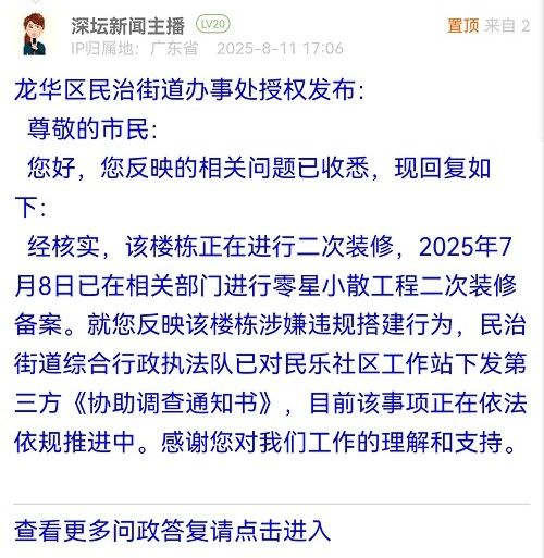 經(jīng)核實,該樓棟正在進行二次裝修,2025年7月8日已在相關(guān)部門進行零星小散工程二次裝修備案。就您反映該樓棟涉嫌違規(guī)搭建行為,民治街道綜合行政執(zhí)法隊已對民樂社區(qū)工作站下發(fā)第三方《協(xié)助調(diào)查通知書》,目前該事項正在依法依規(guī)推進中。感謝您對我們工作的理解和支持。