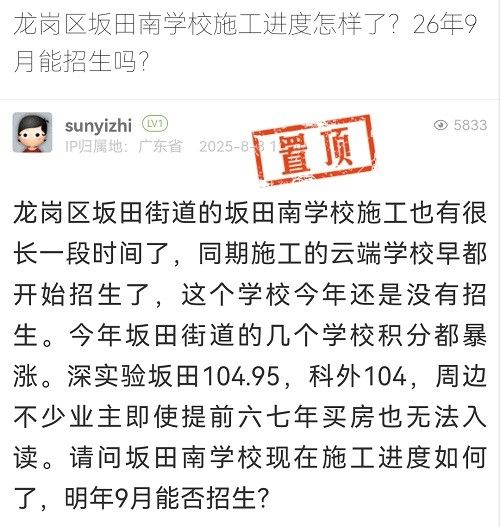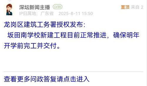23. 帖文《龍崗區(qū)坂田南學(xué)校施工進度怎樣了?26年9月能招生嗎?》