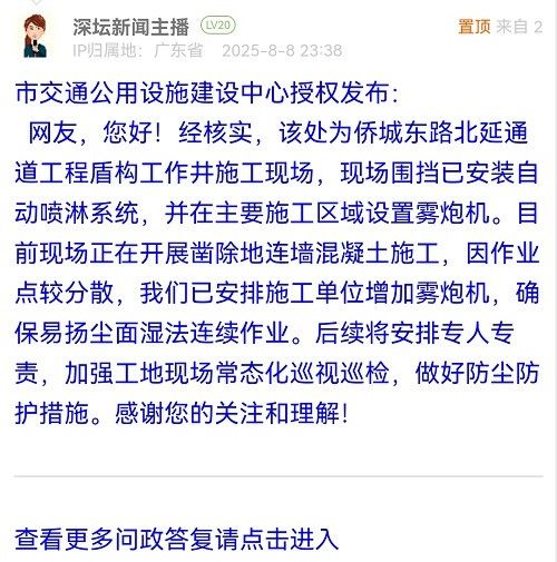 網(wǎng)友,您好!經(jīng)核實,該處為僑城東路北延通道工程盾構(gòu)工作井施工現(xiàn)場,現(xiàn)場圍擋已安裝自動噴淋系統(tǒng),并在主要施工區(qū)域設(shè)置霧炮機。目前現(xiàn)場正在開展鑿除地連墻混凝土施工,因作業(yè)點較分散,我們已安排施工單位增加霧炮機,確保易揚塵面濕法連續(xù)作業(yè)。后續(xù)將安排專人專責(zé),加強工地現(xiàn)場常態(tài)化巡視巡檢,做好防塵防護措施。感謝您的關(guān)注和理解!