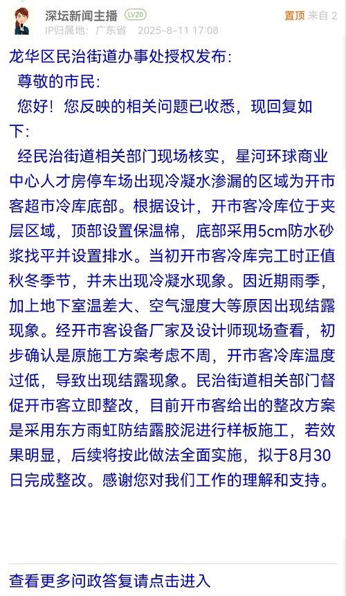 經(jīng)民治街道相關(guān)部門現(xiàn)場核實,星河環(huán)球商業(yè)中心人才房停車場出現(xiàn)冷凝水滲漏的區(qū)域為開市客超市冷庫底部。根據(jù)設(shè)計,開市客冷庫位于夾層區(qū)域,頂部設(shè)置保溫棉,底部采用5cm防水砂漿找平并設(shè)置排水。當(dāng)初開市客冷庫完工時正值秋冬季節(jié),并未出現(xiàn)冷凝水現(xiàn)象。因近期雨季,加上地下室溫差大、空氣濕度大等原因出現(xiàn)結(jié)露現(xiàn)象。經(jīng)開市客設(shè)備廠家及設(shè)計師現(xiàn)場查看,初步確認是原施工方案考慮不周,開市客冷庫溫度過低,導(dǎo)致出現(xiàn)結(jié)露現(xiàn)象。民治街道相關(guān)部門督促開市客立即整改,目前開市客給出的整改方案是采用東方雨虹防結(jié)露膠泥進行樣板施工,若效果明顯,后續(xù)將按此做法全面實施,擬于8月30日完成整改。感謝您對我們工作的理解和支持。