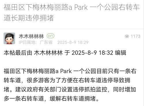 27. 帖文《福田區(qū)下梅林梅麗路a?Park?一個公園右轉(zhuǎn)車道長期違停擁堵》