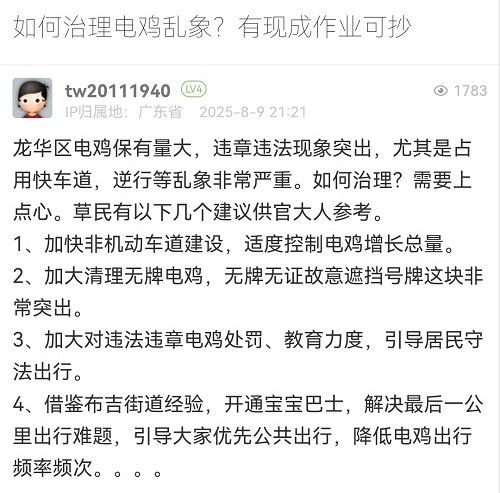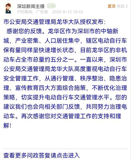 感謝您的反饋。龍華區(qū)作為深圳市的中軸新城,產(chǎn)業(yè)密集、人口居住集中,轄區(qū)電動自行車保有量同樣呈快速增長狀態(tài),目前龍華區(qū)的非機動車占全市總量約五分之一。一直以來,深圳市公安局交通管理局龍華大隊高度重視電動自行車安全管理工作,從通行管理、秩序整治、隱患治理、宣傳教育四大方面綜合施策,不斷優(yōu)化治理策略,切實提升電動自行車交通管理水平。您的建議我們也會向相關(guān)部門反饋,共同努力治理電動車。再次感謝您對交通管理工作的支持和理解!