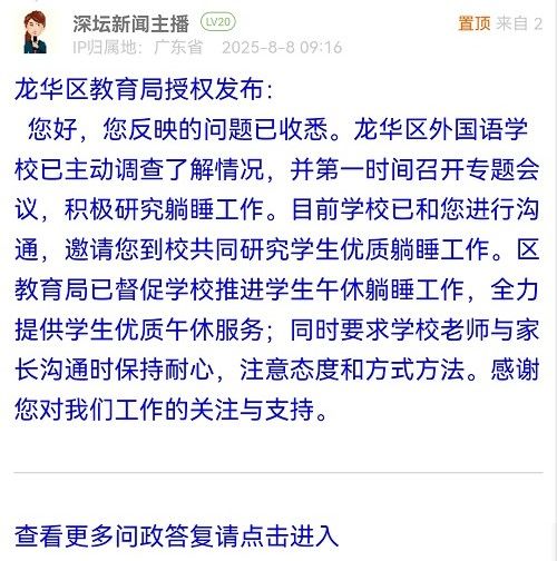 您好,您反映的問題已收悉。龍華區(qū)外國語學(xué)校已主動調(diào)查了解情況,并第一時間召開專題會議,積極研究躺睡工作。目前學(xué)校已和您進行溝通,邀請您到校共同研究學(xué)生優(yōu)質(zhì)躺睡工作。區(qū)教育局已督促學(xué)校推進學(xué)生午休躺睡工作,全力提供學(xué)生優(yōu)質(zhì)午休服務(wù);同時要求學(xué)校老師與家長溝通時保持耐心,注意態(tài)度和方式方法。感謝您對我們工作的關(guān)注與支持。