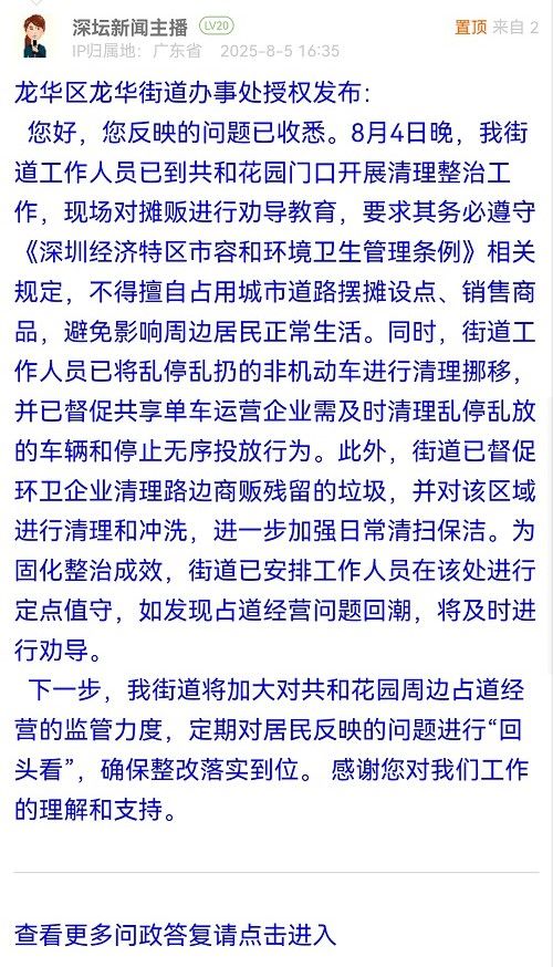 您好,您反映的問題已收悉。8月4日晚,我街道工作人員已到共和花園門口開展清理整治工作,現(xiàn)場對攤販進行勸導(dǎo)教育,要求其務(wù)必遵守《深圳經(jīng)濟特區(qū)市容和環(huán)境衛(wèi)生管理條例》相關(guān)規(guī)定,不得擅自占用城市道路擺攤設(shè)點、銷售商品,避免影響周邊居民正常生活。同時,街道工作人員已將亂停亂扔的非機動車進行清理挪移,并已督促共享單車運營企業(yè)需及時清理亂停亂放的車輛和停止無序投放行為。此外,街道已督促環(huán)衛(wèi)企業(yè)清理路邊商販殘留的垃圾,并對該區(qū)域進行清理和沖洗,進一步加強日常清掃保潔。為固化整治成效,街道已安排工作人員在該處進行定點值守,如發(fā)現(xiàn)占道經(jīng)營問題回潮,將及時進行勸導(dǎo)。