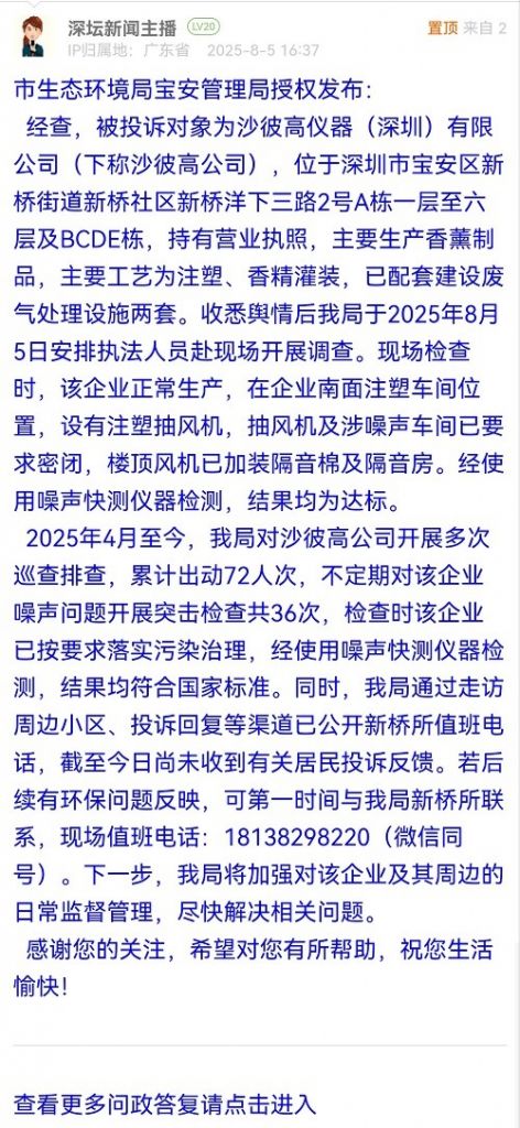 經(jīng)查,被投訴對象為沙彼高儀器(深圳)有限公司(下稱沙彼高公司),位于深圳市寶安區(qū)新橋街道新橋社區(qū)新橋洋下三路2號A棟一層至六層及BCDE棟,持有營業(yè)執(zhí)照,主要生產(chǎn)香薰制品,主要工藝為注塑、香精灌裝,已配套建設(shè)廢氣處理設(shè)施兩套。收悉輿情后我局于2025年8月5日安排執(zhí)法人員赴現(xiàn)場開展調(diào)查?,F(xiàn)場檢查時,該企業(yè)正常生產(chǎn),在企業(yè)南面注塑車間位置,設(shè)有注塑抽風(fēng)機,抽風(fēng)機及涉噪聲車間已要求密閉,樓頂風(fēng)機已加裝隔音棉及隔音房。經(jīng)使用噪聲快測儀器檢測,結(jié)果均為達標。