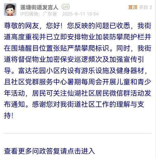 尊敬的網(wǎng)友,您好!您反映的問題已收悉,我街道高度重視并已立即安排物業(yè)加裝防攀爬護欄并在圍墻醒目位置張貼嚴禁攀爬標識。同時,我街道將督促物業(yè)加密保安巡邏頻次及加強宣傳引導(dǎo)。富達花園小區(qū)內(nèi)設(shè)有游樂設(shè)施及健身器材,且社區(qū)黨群服務(wù)中心暑期每周會開展兒童和青少年活動,居民可關(guān)注仙湖社區(qū)居民微信群活動發(fā)布通知。感謝您對我街道社區(qū)工作的理解與支持!