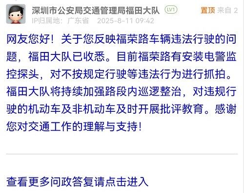 網(wǎng)友您好!關(guān)于您反映福榮路車輛違法行駛的問題,福田大隊已收悉。目前福榮路有安裝電警監(jiān)控探頭,對不按規(guī)定行駛等違法行為進行抓拍。福田大隊將持續(xù)加強路段內(nèi)巡邏整治,對違規(guī)行駛的機動車及非機動車及時開展批評教育。感謝您對交通工作的理解與支持!