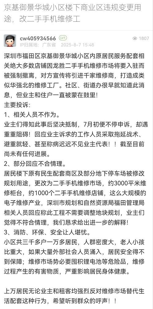 18. 帖文《京基御景華城小區(qū)樓下商業(yè)區(qū)違規(guī)變更用途,改二手手機維修工》