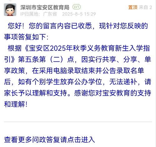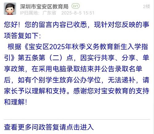 根據(jù)《寶安區(qū)2025年秋季義務(wù)教育新生入學(xué)指引》第五條第(二)點,因?qū)嵭泄蚕?、分享、單享政策,在采用電腦錄取結(jié)束并公告錄取名單后,如有個別學(xué)生放棄公辦學(xué)位,無法遞補,請家長予以理解和支持。感謝您對寶安教育的支持和理解!