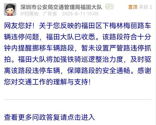 網(wǎng)友您好!關(guān)于您反映的福田區(qū)下梅林梅麗路車輛違停問題,福田大隊已收悉。該路段符合十分鐘內(nèi)提醒挪移車輛路段,暫未設(shè)置嚴管路違停抓拍。福田大隊將加強鐵騎巡邏整治力度,及時驅(qū)離該路段違停車輛,保障路段的安全通暢。感謝您對交通工作的理解與支持!