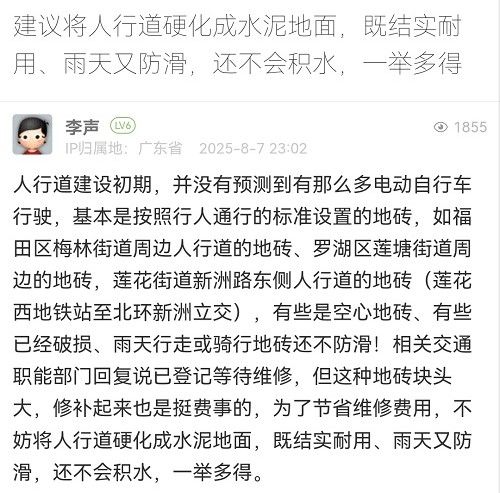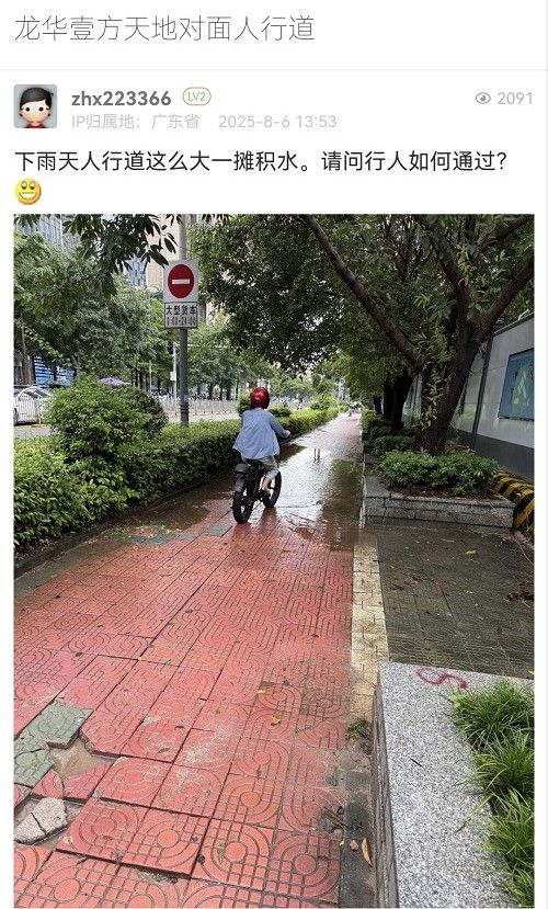 21. 帖文《建議將人行道硬化成水泥地面,既結(jié)實耐用、雨天又防滑,還不會積水,一舉多得》