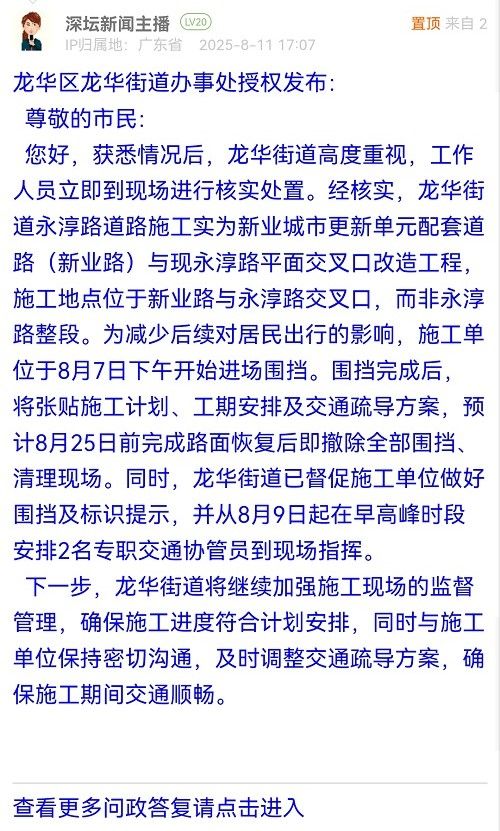 您好,獲悉情況后,龍華街道高度重視,工作人員立即到現(xiàn)場進行核實處置。經(jīng)核實,龍華街道永淳路道路施工實為新業(yè)城市更新單元配套道路(新業(yè)路)與現(xiàn)永淳路平面交叉口改造工程,施工地點位于新業(yè)路與永淳路交叉口,而非永淳路整段。為減少后續(xù)對居民出行的影響,施工單位于8月7日下午開始進場圍擋。圍擋完成后,將張貼施工計劃、工期安排及交通疏導(dǎo)方案,預(yù)計8月25日前完成路面恢復(fù)后即撤除全部圍擋、清理現(xiàn)場。同時,龍華街道已督促施工單位做好圍擋及標識提示,并從8月9日起在早高峰時段安排2名專職交通協(xié)管員到現(xiàn)場指揮。