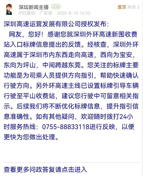 網(wǎng)友,您好!感謝您就深圳外環(huán)高速新圍收費站入口標牌信息提出的反饋。經(jīng)核查,深圳外環(huán)高速屬于深圳市內(nèi)東西走向高速,西向為寶安,東向為坪山,中間跨越東莞。您關(guān)注的標牌主要功能是為司乘人員提供方向指引,幫助快速確認行駛方向。另外環(huán)高速主線已設(shè)置標牌引導(dǎo)車輛行駛至平山收費站,建議您行駛中可留意相關(guān)指示。后續(xù)我們將不斷優(yōu)化標牌信息,提升指引信息準確性。如有其他疑問,歡迎隨時撥打24小時服務(wù)熱線:0755-88833118進行反映,以便更快為您做出處理。